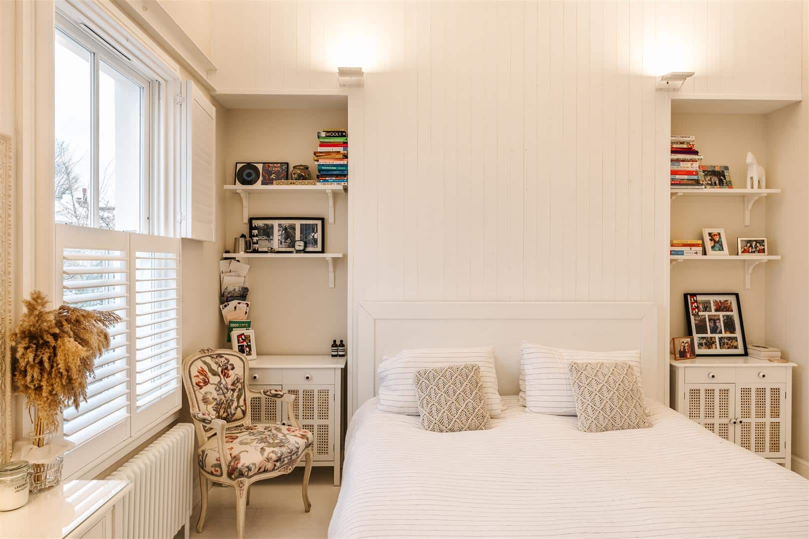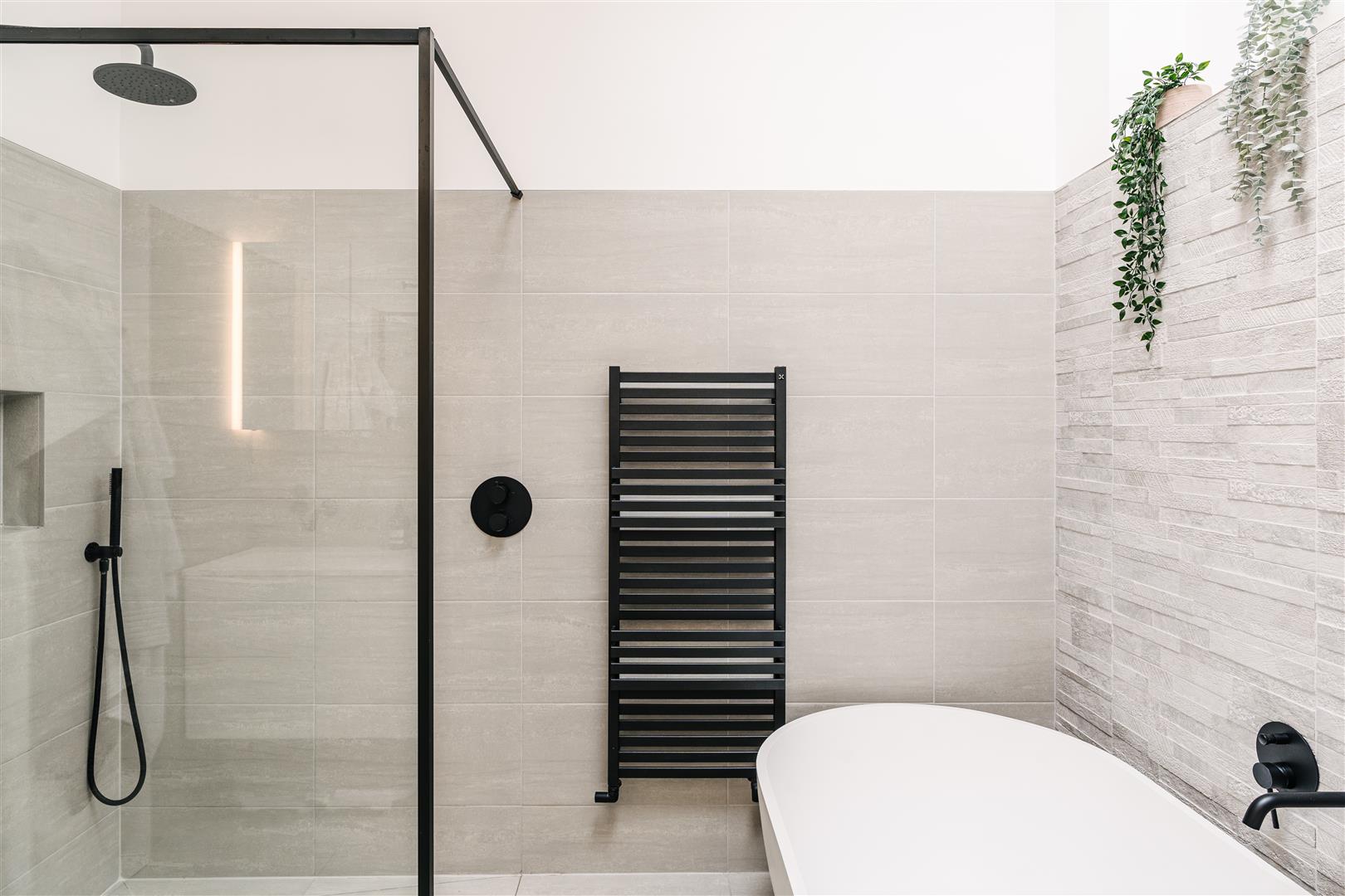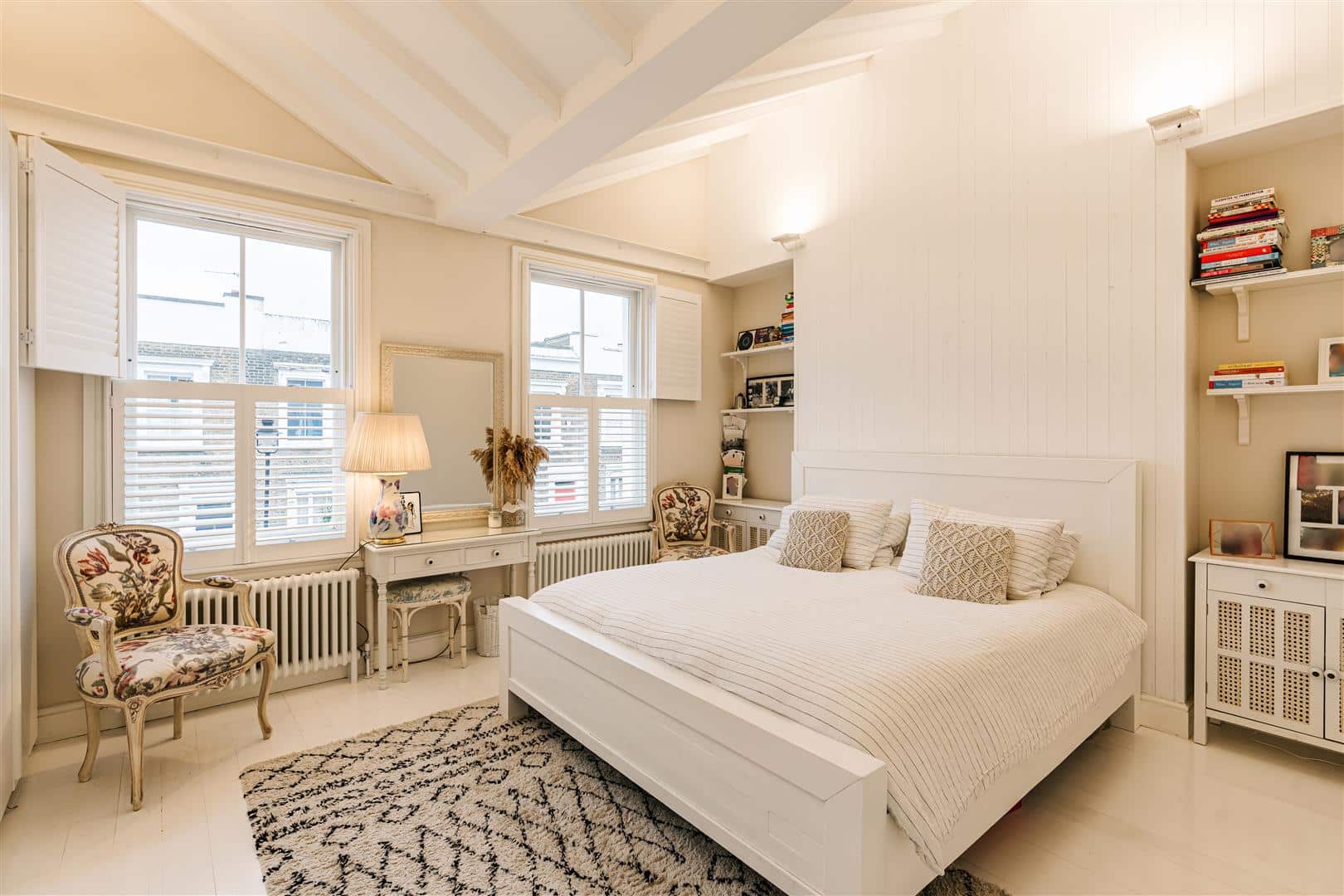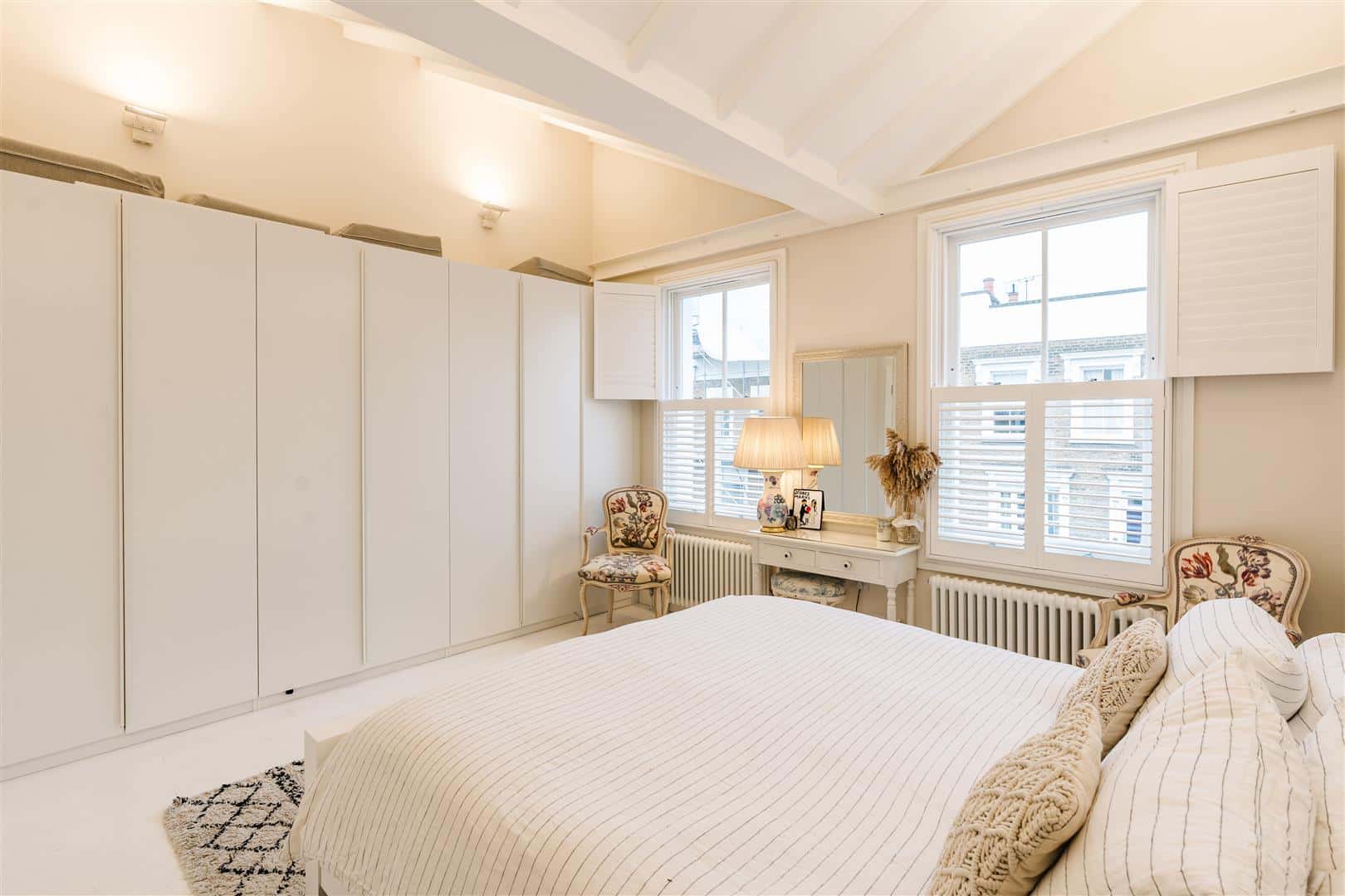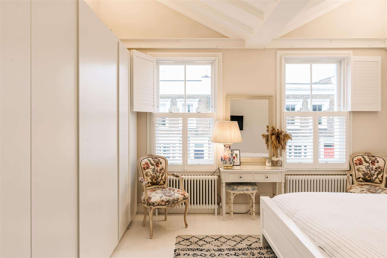 On the first floor are two very good double bedrooms, the principal bedroom opens into the butterfly roof and features an excellent range of fitted wardrobes, the very sizeable second bedroom has a striking full-height dual aspect corner window