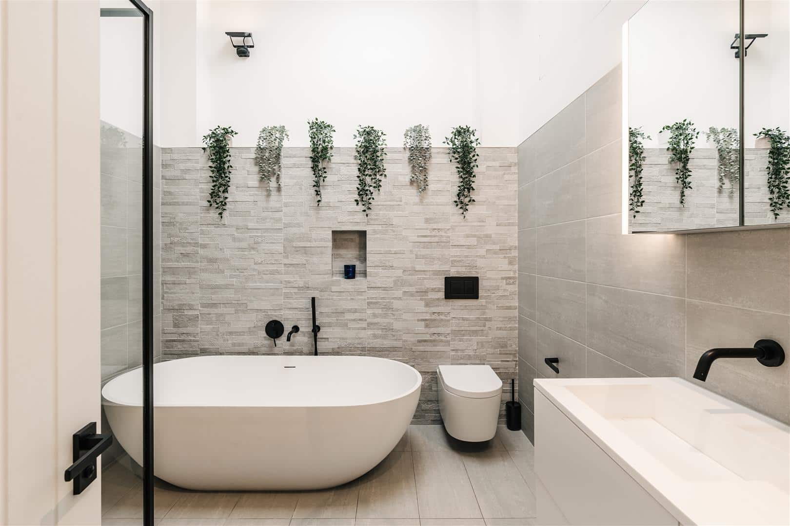 To the rear is a meticulously constructed smart, low-maintenance modern garden, paved with raised beds and a birch tree.